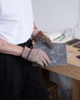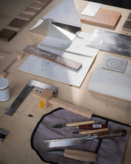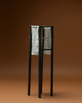 Building around this elevated layer, stained ash forms a body to cradle the etching. The veil, sewn from a found textile, is brought together with the frame through simple assemblage, affixed with two green buttons on each side. For us, tools are both functional and improvisational; this flexibility is core to how our pieces evolve during the process”.