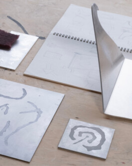 Our process is intuitive and in this case began with a fragment; here, a repurposed engraved metal sheet from a previous piece became a table surface.