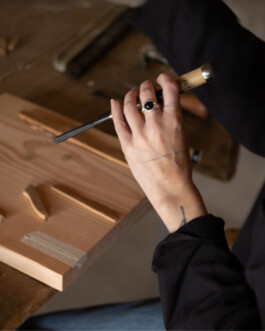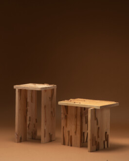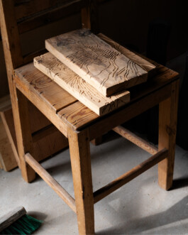 “The work with the Japanese chisels has, in this project, been a way to come into close contact with the material, through a slow approach to the method of removing and adding, in a narrative of relief and ornamentation. The pieces have been created through an intuitive creative process, where composition and overall expression have emerged through negotiation during the making of the two components, whose construction is in Douglas fir and ornamentation in pine.”